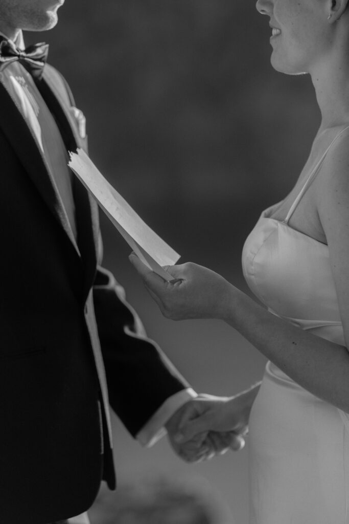 They exchanged vows as the light stretched low across the peaks, personal words they’d written for each other, full of gratitude, adventure, and quiet joy. The air was still; not a breath of wind. Just the soft sound of their voices carrying through the valley.