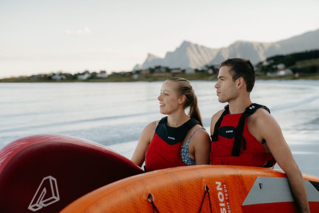 Sol and Petter carried their paddle-boards down to the shoreline and slipped quietly into the Arctic sea — calm, steady, completely in sync. You could tell they were at home in the cold; it didn’t faze them for a second.